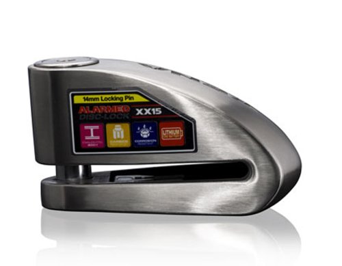 Riding your bike should be a thrill experienced by you, not an opportunistic thief. A simple deterrent and the thief moves on to an unlocked motorcycle. Xena disc brake locks help prevent ride and roll away thefts. The alarm alerts to tampering and as a REMINDER that a lock is attached to your motorcycle.British engineered XENA disc locks for motorcycles are the strongest, lightest disc locks in the world. Shock & motion sensors linked to a sophisticated microprocessor trigger a 120dB alarm powered by a single CR2 long-life Lithium battery. Self-arming, with no on-off switch, re-sets automatically to armed mode within 15 seconds.The high-performance XX-15 lock is one of the heavier duty Xena disc brake locks. This lock features a 14mm locking pin, making it stronger than the Xena locks featuring the smaller 6mm pin. Manufactured with a high nickel content stainless-steel mono-block construction. The lock has a high security key, carbide reinforced lock barrel with a unique double locking system. The piercing alarm and give the XX-15 a remarkably effective way to protect your motorbike. ALARM FEATURES:120dB Alarm Auto-arm / Dis-arm Detachable alarm module Shock & movement sensors Batteries: one long-life CR2 lithium batteryLOCK FEAURES:Ultra-High Strength 14mm Carbide-Reinforced Pin Built to withstand tough weather conditions, including heavy rains. Double-Locking System Maximum Security Key & Barrel