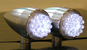 One set of 2 White LED lights in Polished Aluminum Teardrop Housings.Perfect for any car, truck, boat, airplane, motorcycle, trailer, ATV, golf cart, dune buggy, sand car, go-cart or other vehicle that operates on 12 volts and extra lighting is desired. These lights have two internal lamps. One is normal intensity, the other is super bright.