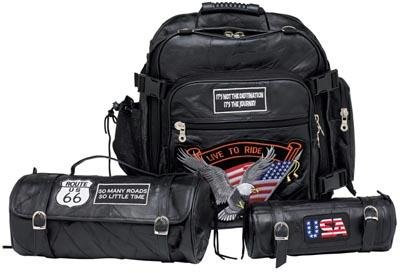 Includes: 11" x 4-1/2" x 3-7/8" tool bag, 14" x 5-7/8" x 5-7/8" barrel bag, and 14? x 18" x 7-1/4? sissy bar bag. Each set has a total of 5 patches on it. Embroidered patches are included and already sewn in place!